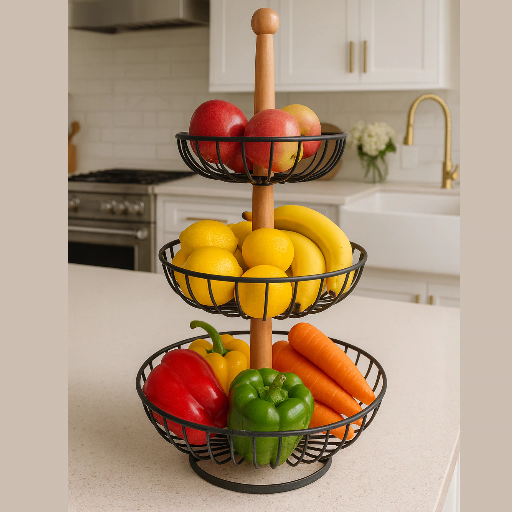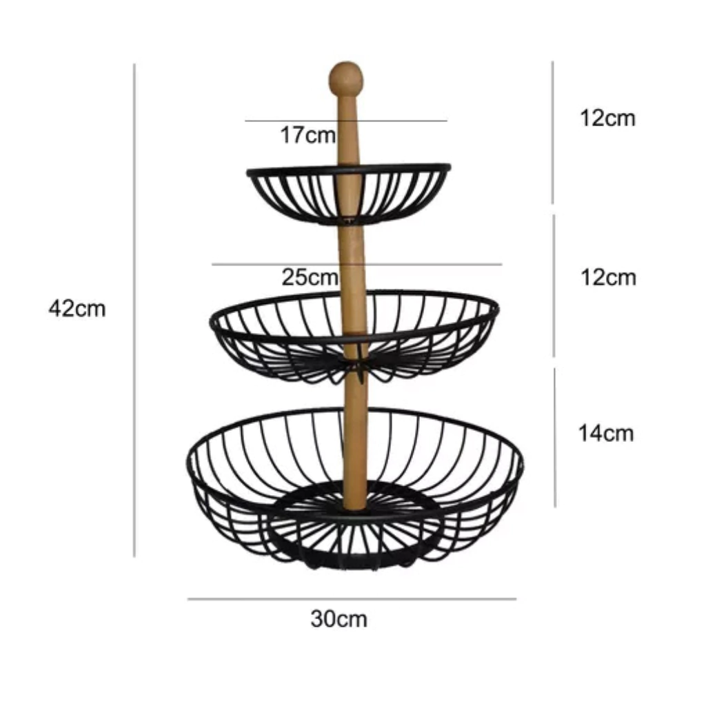 Frutera Triple en Metal Negro Descubre la elegancia y funcionalidad de nuestra frutera doble en metal negro. Con un diámetro de 30 cm y una altura de 45 cm, es el complemento perfecto para tu mesa. Su diseño contemporáneo no solo realza la presentación de tus frutas, sino que también aporta un toque moderno a tu decoración. Fabricada en metal de alta calidad, esta frutera es resistente y duradera, ideal para cualquier ocasión. Transforma tu hogar con este accesorio práctico y estilizado.