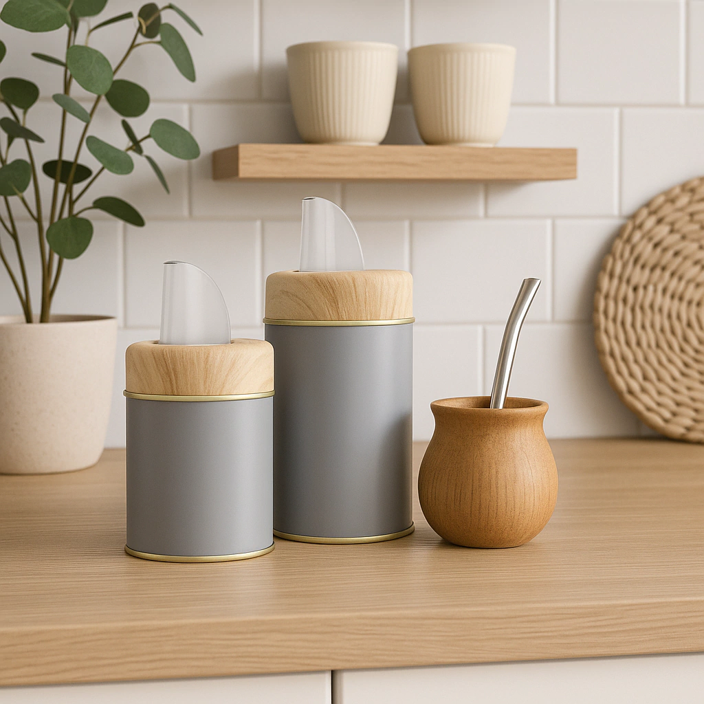 SET MATERO X2 NORDICO GRIS Capacidad 250gr. Pico plastico rebatible. Apto alimentos. Medidas: Azucarera: 8.4cm de diámetro x 11.5cm de alto Yerbera: 8.4cm de diámetro x 17cm de alto